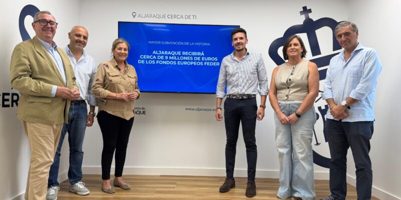 Aljaraque está de enhorabuena ya que este viernes se ha dado a conocer la resolución provisional que adjudica al consistorio, a través de los fondos europeos FEDER (Fondo Europeo de Desarrollo Regional), la cantidad de 8.961.678 millones de euros. De esta forma se valida el proyecto presentado por la administración local ‘Plan de Actuación Integrado’ en el que los vecinos han tenido un papel esencial en su elaboración. La noticia ha sido anunciada por el alcalde de Aljaraque, Adrián Cano, junto a la primera Teniente de Alcalde y concejala de Cultura, Ana Mora, Leticia Villegas, segunda Teniente de Alcalde y concejala de Deportes, Ignacio Pomares, concejal de Hacienda, Samuel Murillo, concejal de Desarrollo Local, y José Luis Barragán, concejal de Promoción Turística.