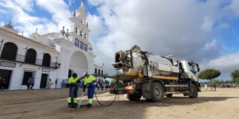 En cuanto a la red de alcantarillado, ésta se revisa y limpia previamente a la llegada de las hermandades para evitar atascos, dando un tratamiento especial a las zonas más conflictivas, como pueden ser Torre Carbonero, Camino Puente El Rey, C/ Sanlúcar y C/ Sacrificio, así como las de las zonas de acampada de las Hermandades en C/ Santaolalla, C/ Boca el Lobo y La Dehesilla.
