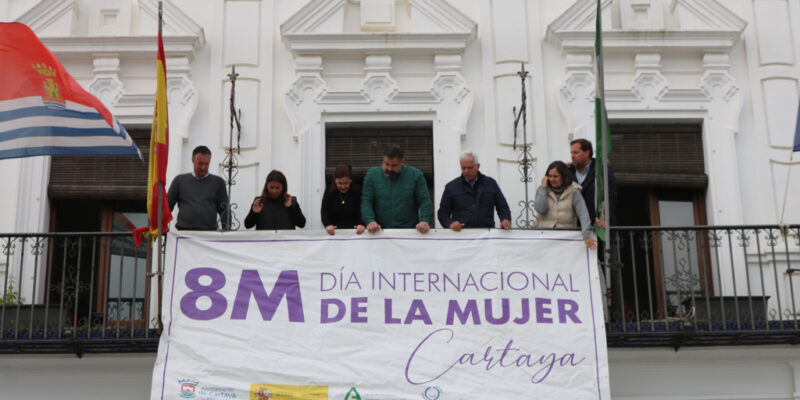 Cartaya despliega este lunes una pancarta conmemorativa en la fachada del Edificio Consistorial que abre una semana en la que el Ayuntamiento de Cartaya, a través del área de Igualdad, desarrolla talleres, actividades de teatro cuentacuentos, cursos formativos y actos institucionales, para recordar la necesidad de promover la igualdad real entre hombres y mujeres.