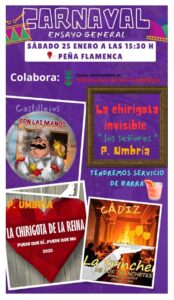 Este sábado 25 de Enero, tendrá lugar una convivencia carnavalera en la peña Flamenca con diferentes agrupaciones, locales, de Punta Umbría y gaditana, donde con su ensayos generales comenzarán a sonar los primeros platillazos en el municipio.