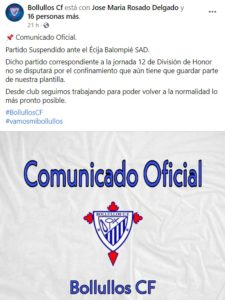 Debido a lo corto del calendario, el choque se deberá jugar entre semana. Los bollulleros anunciaron en sus redes sociales la noticia: “Partido Suspendido ante el Écija Balompié SAD. Dicho partido correspondiente a la jornada 12 de División de Honor no se disputará por el confinamiento que aún tiene que guardar parte de nuestra plantilla. Desde club seguimos trabajando para poder volver a la normalidad lo más pronto posible”.