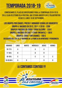 El club isleño ya prepara la nueva temporada. La entidad costera, que quiere captar a nuevos atletas, ha mostrado los horarios de entrenamientos diferenciado por categorías de esta nueva campaña 2018-19.