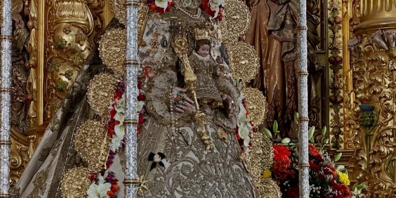 La Virgen del Rocío ya se encuentra entronizada en su paso aguardando la espera de una nueva romería. Luce el conocido “Traje de los Apóstoles” y destaca la corona de la Coronación Canónica del año 1919, además del rostrillo que le regalara el canónigo Muñoz y Pabón.