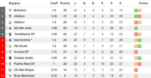 Por otro lado, el CD San Roque de Cádiz está colocado como penúltimo con 14 puntos después de acumular una derrota y un encuentro aplazado en las dos jornadas disputadas.