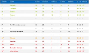 No obstante, el Recre ya solo goza de un partido de ventaja con respecto al play out de permanencia, a los cruces de los que salen dos equipos que mantienen la categoría y otros dos que descienden. Esta eliminatoria la jugaría el Talavera mientras que el Recre solo goza de cinco puntos respecto al descenso directo a Tercera División, zona que marca el Algeciras.