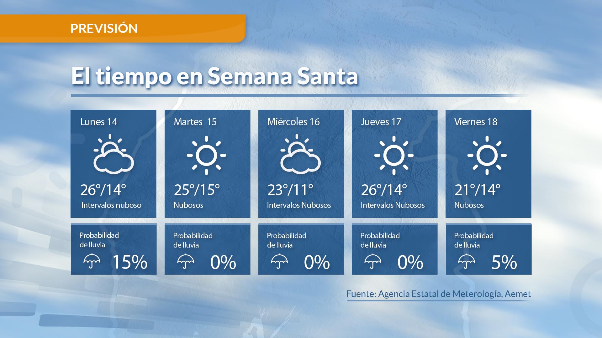 LUNES SANTO: Habrá abundante nubosidad media y alta y por la mañana existe posibilidad de chubascos débiles y de poca duración. A partir del mediodía irá disminuyendo la nubosidad poco a poco y sobre media tarde desaparece por completo el riesgo de chubascos. Las temperaturas subirán ligeramente.