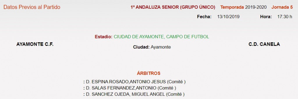 El Ayamonte se medirá este domingo a las cinco y media de la tarde ante el CD Canela con una amplia distancia clasificatoria entre ambos, a pesar de las cuatro jornadas disputadas. Los de la barriada ayamontina están colocados como penúltimos con tan solo un punto cosechado; por otro lado, los de Juan Palma suman siete puntos y están en la quinta plaza.Conforme a árbitros, la responsabilidad caerá en Espina Rosada (árbitro principal), Salas Fernández (asistente) y Sánchez Ojeda (asistente) en un Ciudad de Ayamonte que estará lleno hasta la bandera.
