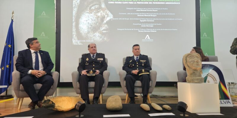 La Policía Adscrita a la Comunidad Autónoma de Andalucía recibía en la tarde de ayer un reconocimiento por parte de la Junta por la protección y defensa del patrimonio arqueológico de la provincia onubense. Gracias a ese trabajo policial, el pasado año se localizaron menhires en Almonaster la Real y Beas; también se incautaron un busto en roca, que está en estudio para datación y procedencia, y se han constado posibles grabados en roca en Almonaster la Real.