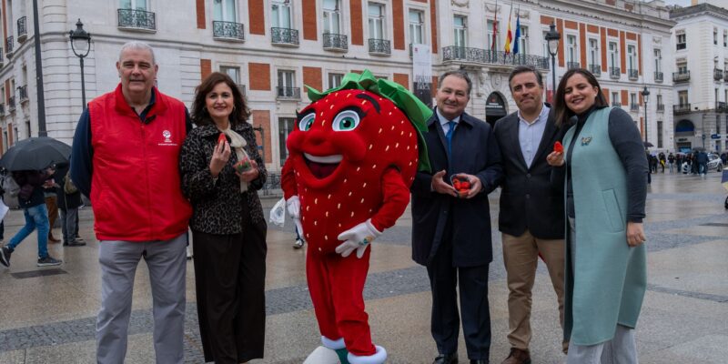 El presidente David Toscano Contreras, la diputada de Agricultura, Patricia Millán y la de Bienestar Social, Carmen Diaz, junto al secretario general de UPA Huelva, Manuel Piedra, han presentado en la Puerta del Sol de Madrid, con una espectacular acogida, la segunda campaña ‘Yo como fresas en Huelva’
