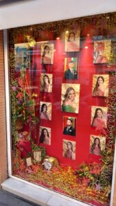 En plena Gran Vía estos vistosos y decorados paneles, muestran las fotografías de las jóvenes y niñas, junto a sus pajes, en unas fotografías de gran formato, un trabajo realizado por Francisco Ginés.