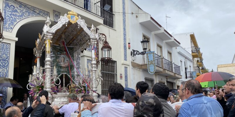 Bajo un cielo de papelillos en la calle Mayor (popularmente conocida como calle Caños), eran más los paraguas que se sumaban a la comitiva donde no faltaban cantes, vivas y palmas para demostrar la fe y devoción de todo un pueblo.