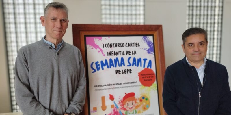 El concejal de Cultura y Festejos del Ayuntamiento de Lepe, José Manuel Cortés junto a el presidente del Consejo General de Hermandades y Cofradías de la ciudad de Lepe, Manuel Pérez presentaban el primer Concurso del cartel infantil de la Semana Santa de Lepe, que se organiza desde el consejo y que estará abierto a la participación de los escolares del municipio.