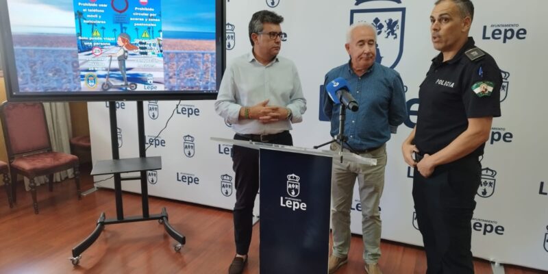 El alcalde de Lepe, Adolfo Verano; el teniente de alcalde delegado de Seguridad Ciudadana, Carmelo Sánchez, y el agente de Policía Local Francisco Santana han presentado la campaña divulgativa e informativa sobre el uso del patinete eléctrico en la localidad, con el objetivo de concienciar sobre las obligaciones que tienen quienes conducen este tipo de vehículos, a fin de garantizar la seguridad del tráfico y de los peatones.