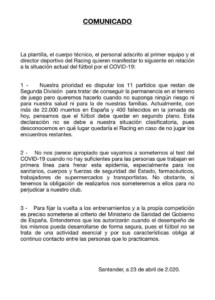 Comunicado plantilla y cuerpo técnico del Rácing de Santander: