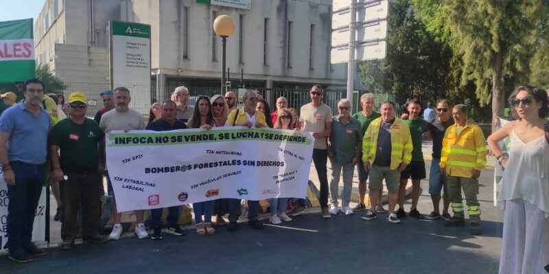 Bomberos forestales del Plan INFOCA se han concentrado este miércoles a las puertas de la Delegación de la Junta de Andalucía para reivindicar las deficiencias que se encuentran en el dispositivo de emergencias EMA.