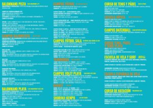 La programación incluye más de 20 campus deportivos entre los que se encuentran balonmano, fútbol, baloncesto, vóley playa, fútbol sala, tenis, pádel, equitación, artes marciales, kárate, surf, y natación. Los campus están adaptados a distintas edades, desde infantil hasta juvenil, con horarios accesibles y descuentos para hermanos.