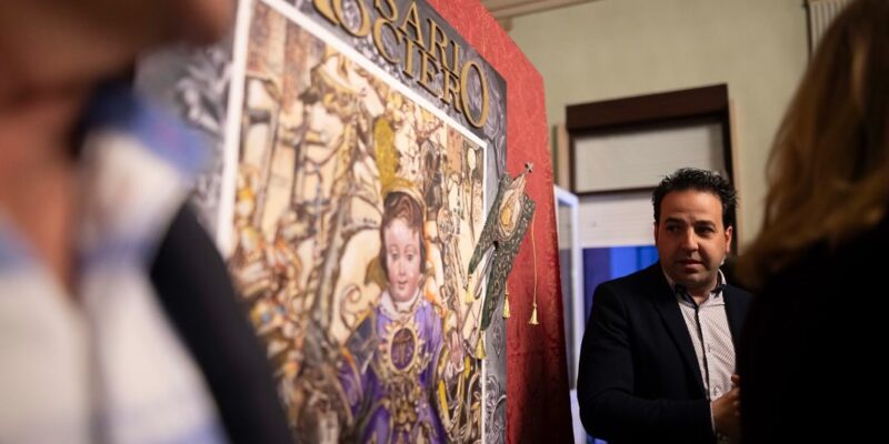 El cartel, inspirado en la devoción rociera, lleva en su diseño el simbolismo de las hermandades con 26 cuentas en el rosario, una por cada hermandad de la provincia, y un Simpecado que conecta la devoción local con el jubileo celebrado en Roma.