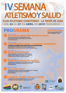 Conforme a ello, el día 22 se hará una clase práctica de «Trabajos de fuerza para mejorar al atleta»; el 23, los usuarios podrán asistir a una charla coloquio sobre «Como prevenir lesiones y aumentar el rendimiento»; el 24, se ceñirá al «Día del atletismo base»; el 25, habrá una charla llamada «Vivencia de una atleta olímpica»; a esta jornada le sigue la del día 26, con una charla coloquio llamada «Zapatillas deportivas»; para terminar la IV Semana Atletismo y Salud el 27 de abril con la IV Marcha-carrera contra el cáncer con salida en la Plaza de España a las 11 horas de la mañana. El recorrido será de cuatro kilómetros.