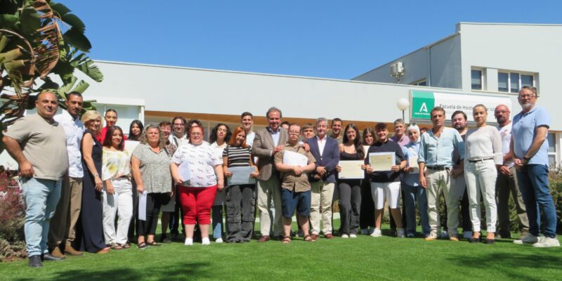 La Escuela de Hostelería de Islantilla, adscrita al Servicio Andaluz de Empleo (SAE), ha finalizado el curso 2024-25 con la entrega de diplomas acreditativos de los 45 alumnos que concluyeron el pasado mes de junio el periodo de prácticas profesionales en 14 prestigiosos establecimientos hosteleros, hoteles y obradores de la costa occidental onubense con los que el SAE ha establecido diferentes convenios de colaboración.